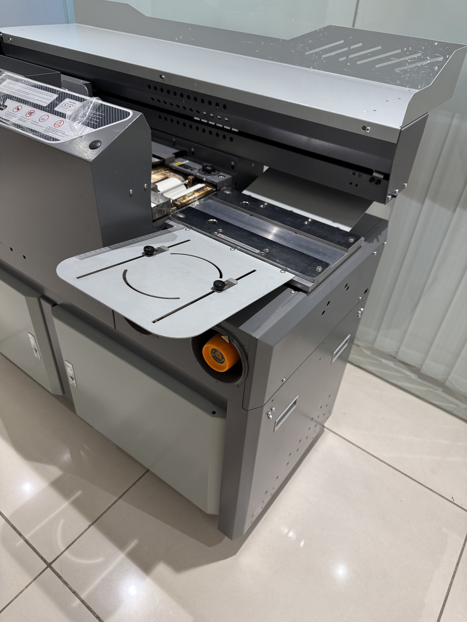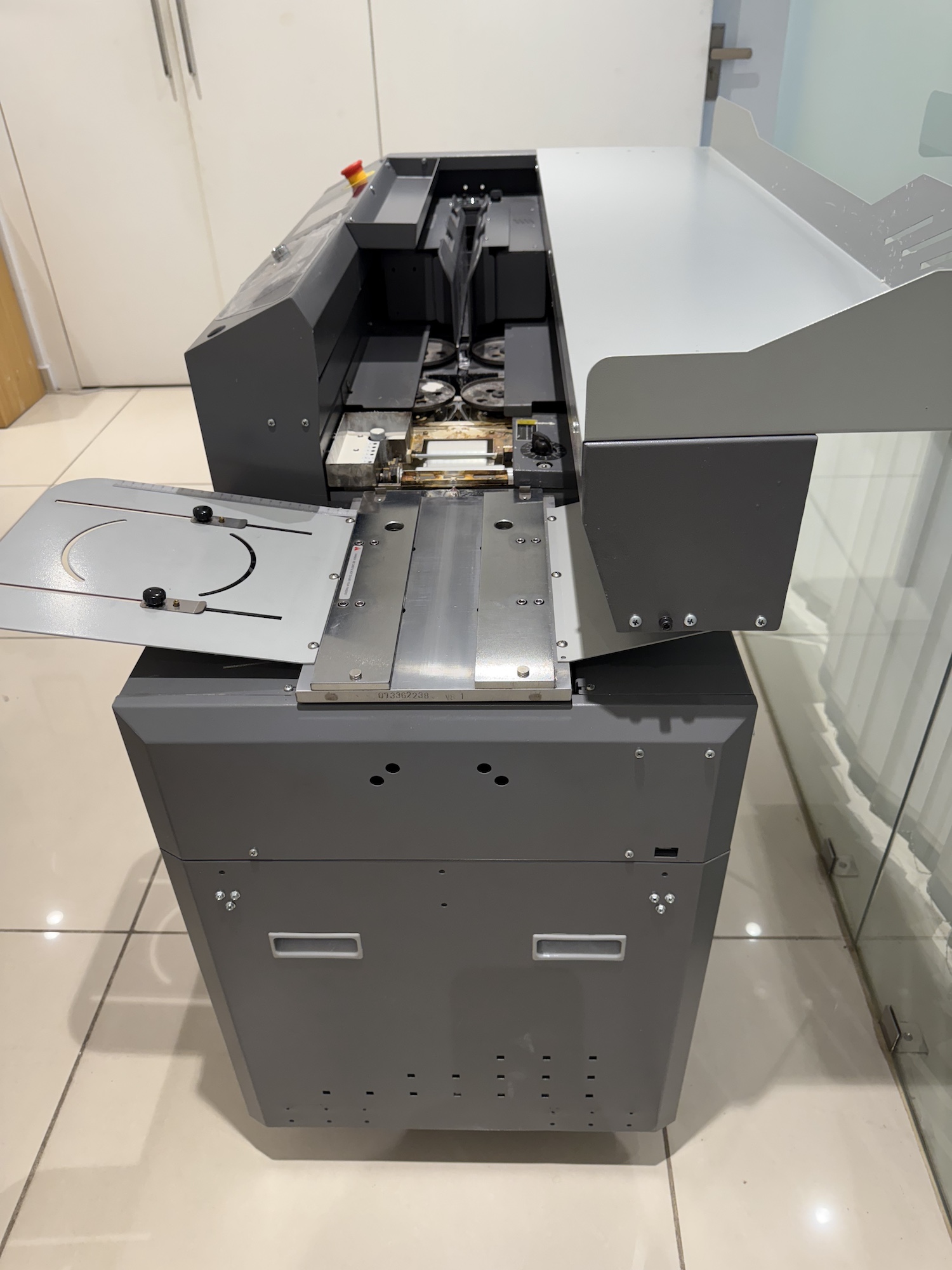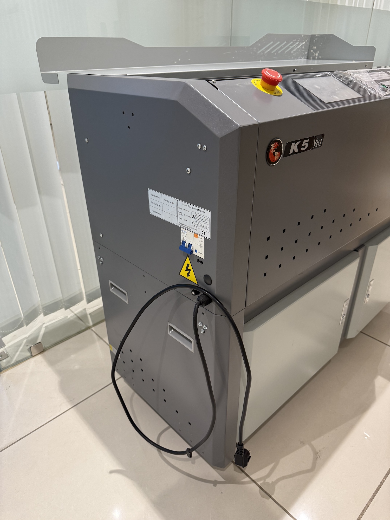 - Specifications: Bind Length:335mm | Bind thickness:60mm | Binding speed:200-350 | Gluing roller:3 | Glue melt time:about 35 mins | Side gluing:yes | Glue pre-heating:yes | Milling cutter:9 | Cover clamping way:automatic | Block clamping way:automatic | Block thickness detection:yes | Smoke extractor:no | Display:touch screen | Size:1250x670x1080mm | Weight: about 220kgs